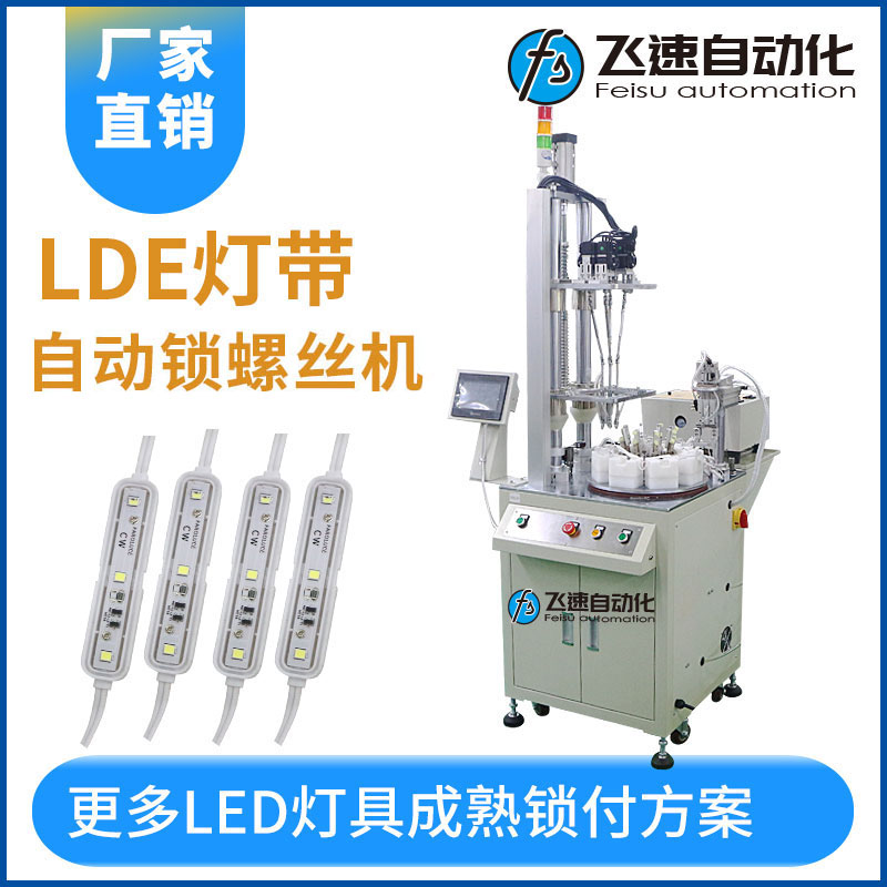 led燈帶是指把LED組裝在帶狀的柔性線路板或PCB硬板上,產(chǎn)品形狀象一條帶子又非常節(jié)能和綠色環(huán)保,用于各個(gè)行業(yè)中的裝飾,LED燈帶的使用也越來越普及,也因?yàn)槭褂脡勖L(一般正常壽命在8~10萬小時(shí)),所以在市場上需求也比較大。 LED燈帶是采用FPC做組裝線路板,生產(chǎn)組裝過程中都需要對燈具貼片和各個(gè)工件進(jìn)行螺絲緊鎖加工,在傳統(tǒng)的生產(chǎn)線上,技術(shù)工人需要對不同型號的燈具體分別進(jìn)行螺絲鎖緊加工操作,雖然也應(yīng)用了自動(dòng)機(jī)器人之類的自動(dòng)設(shè)備,但是傳統(tǒng)生產(chǎn)線的自動(dòng)化水平還比較低,不能適用于不同型號的燈具加工,設(shè)備的自動(dòng)化水平還需提高。 本案例應(yīng)用于LED燈帶自動(dòng)化生產(chǎn)線的自動(dòng)鎖螺絲機(jī),主要目的在于解決生產(chǎn)中的不足和缺點(diǎn),設(shè)計(jì)一臺(tái)自動(dòng)化燈具生產(chǎn)螺絲設(shè)備,它不僅可以對燈具進(jìn)行自動(dòng)化地組裝、鎖緊加工操作,而且可以適用于不同型號、規(guī)格、大小的燈具體,設(shè)備的自動(dòng)化水平比較高。 該設(shè)備根據(jù)產(chǎn)品進(jìn)行設(shè)計(jì)多工位轉(zhuǎn)盤式螺絲機(jī),通過在轉(zhuǎn)盤式安放多個(gè)工位實(shí)現(xiàn)多工序同步作業(yè),主要是為了實(shí)現(xiàn)擰螺絲和取放產(chǎn)品同步完成,作業(yè)員不停放置產(chǎn)品,設(shè)備不停擰螺絲,增強(qiáng)了人機(jī)協(xié)作,較大幅度提升效率,減輕人工勞動(dòng)強(qiáng)度。