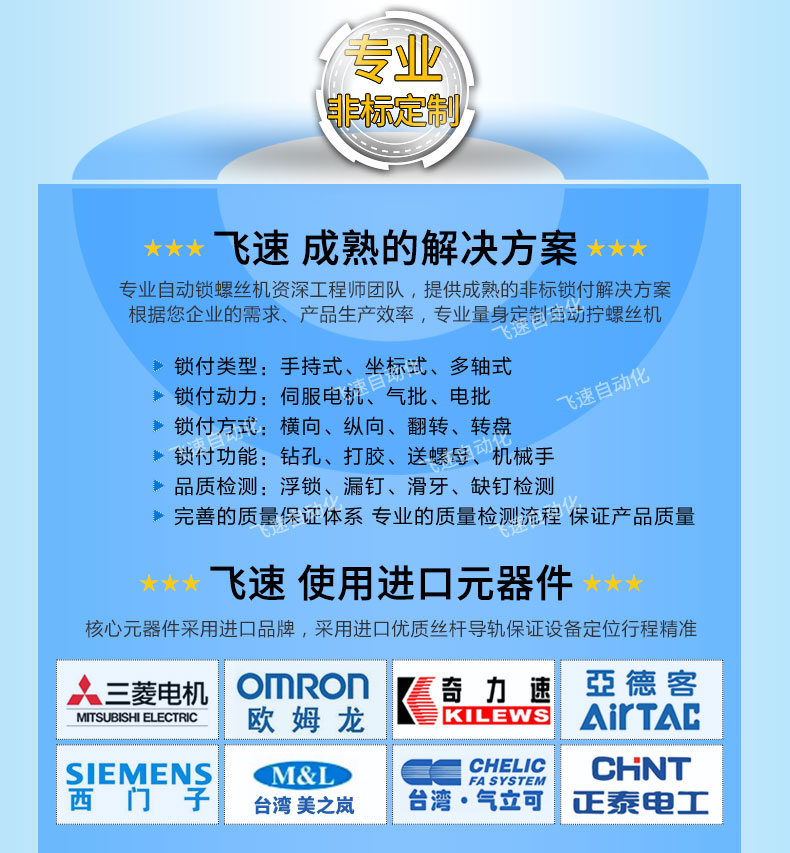 - 產(chǎn)品簡介: 自動(dòng)鎖擰螺母設(shè)備又稱自動(dòng)擰螺母機(jī)、自動(dòng)擰緊螺母機(jī)、自動(dòng)螺母擰緊機(jī)、自動(dòng)螺母鎖付機(jī)等,是用自動(dòng)化機(jī)構(gòu)代替人手完成螺母的取、放、擰緊的自動(dòng)應(yīng)用特點(diǎn)化裝置,稍加改變也可以用于柱壯小零件的自動(dòng)組裝,到了現(xiàn)在,甚至可以通過調(diào)節(jié)扭力大小,確認(rèn)螺母擰緊的位置,從而達(dá)到完美的鎖付螺母。