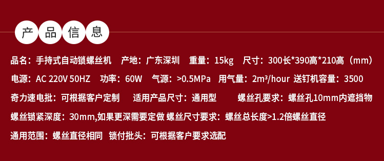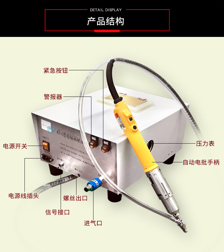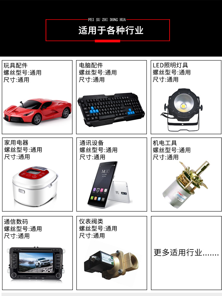• 產品簡介: 手持式鎖螺絲機優點 省成本:單人即可高效操作,省去一名人工。 提效率:1分鐘可鎖60顆螺絲,效率提高1倍。 更輕松:左手無需取螺絲,可用于扶住產品。 更清潔:不再直接接觸螺絲,避免手部接觸造成二次污染而生銹。 形象佳:智能自動化設備令企業生產景象一新,樹立企業高科技形象。 產品適用范圍 1.適用于各種類型的螺絲,螺絲總長應大于1.3倍螺帽直徑; 2.支持深孔螺絲鎖付,孔深小于40mm,M1-M6的螺絲; 3.適用于數碼、電子、小家電、電源開關、燈具、LED、玩具等產品。