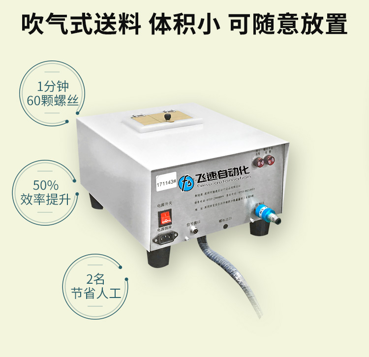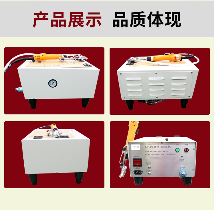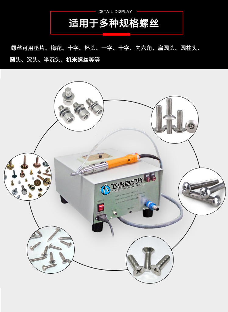 - 產(chǎn)品簡(jiǎn)介: 手持式自動(dòng)打螺絲機(jī)也叫自動(dòng)供料鎖螺絲機(jī)、自動(dòng)擰螺絲機(jī)等,嚴(yán)格來講,手持式只能算是半自動(dòng),因?yàn)樗€是需要手工操作。一臺(tái)手持式自動(dòng)鎖螺絲機(jī)主要由兩部分組成:自動(dòng)供料機(jī)和電批,其中自動(dòng)供料機(jī)是重要的,也是復(fù)雜的,它的好壞直接關(guān)系到機(jī)器卡不卡料的問題。1.采用渦輪上料,體積和噪音小、重量輕,可存放在工作平臺(tái)上,節(jié)省空間; 飛速手持式螺絲機(jī): 1.螺絲自動(dòng)排列、供料,自動(dòng)篩選異型螺絲,自動(dòng)補(bǔ)給空料,無料會(huì)自動(dòng)報(bào)警; 2.送料采用感應(yīng)器控制,鎖付完一顆來一顆,自動(dòng)送料,不會(huì)出現(xiàn)重復(fù)給料現(xiàn)象; 3.滑牙不送料:在鎖付工程中,扭力達(dá)不到,螺絲不送出,防止批嘴出現(xiàn)卡料現(xiàn)象; 4.穩(wěn)定性好,不卡料,即使不良導(dǎo)致卡料,非專業(yè)人員也可以在幾秒鐘內(nèi)解決卡料; 5.效率高,一般1秒鐘打一個(gè)螺絲,不用抓起螺絲,只需對(duì)準(zhǔn)螺絲孔位鎖緊螺絲即可; 6.可減少1到2個(gè)工人螺絲鎖付作業(yè),實(shí)現(xiàn)半自動(dòng)化生產(chǎn),降低工人的勞動(dòng)強(qiáng)度,提高生產(chǎn)率; 7.關(guān)鍵部位采用高品質(zhì)五金材料并經(jīng)過特殊處理,電子原器件采用原裝進(jìn)口,確保設(shè)備零故障。 產(chǎn)品適用范圍 1.適用于各種類型的螺絲,螺絲總長(zhǎng)應(yīng)大于1.3倍螺帽直徑; 2.支持深孔螺絲鎖付,孔深小于40mm,M1-M6的螺絲; 3.適用于數(shù)碼、電子、小家電、電源開關(guān)、燈具、LED、玩具等產(chǎn)品。